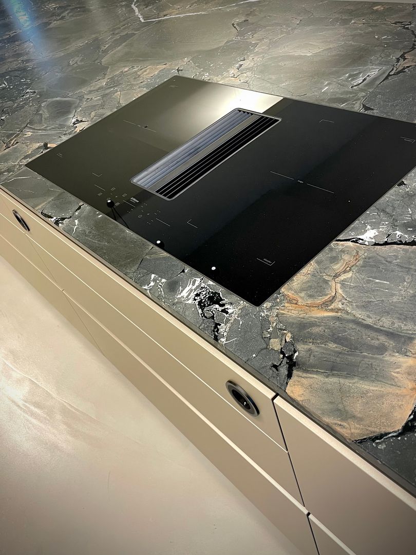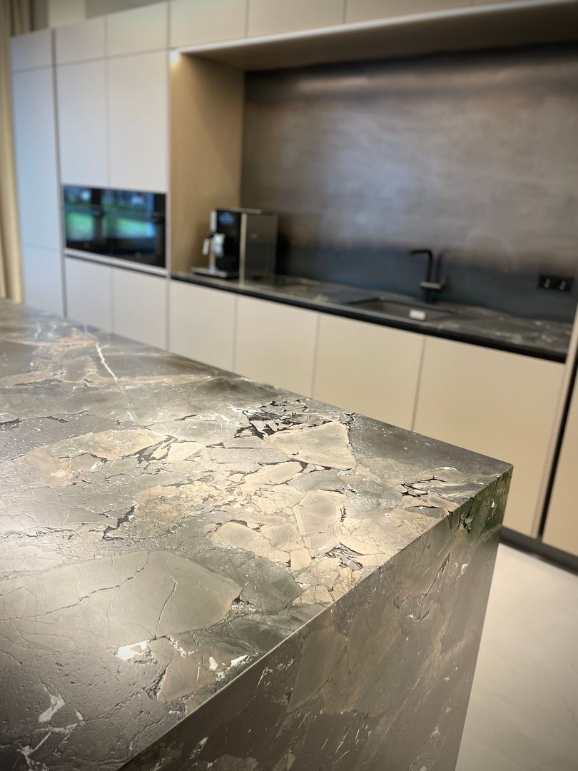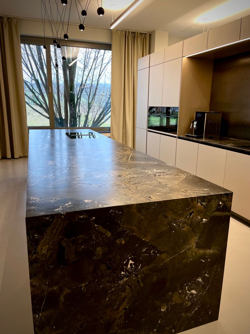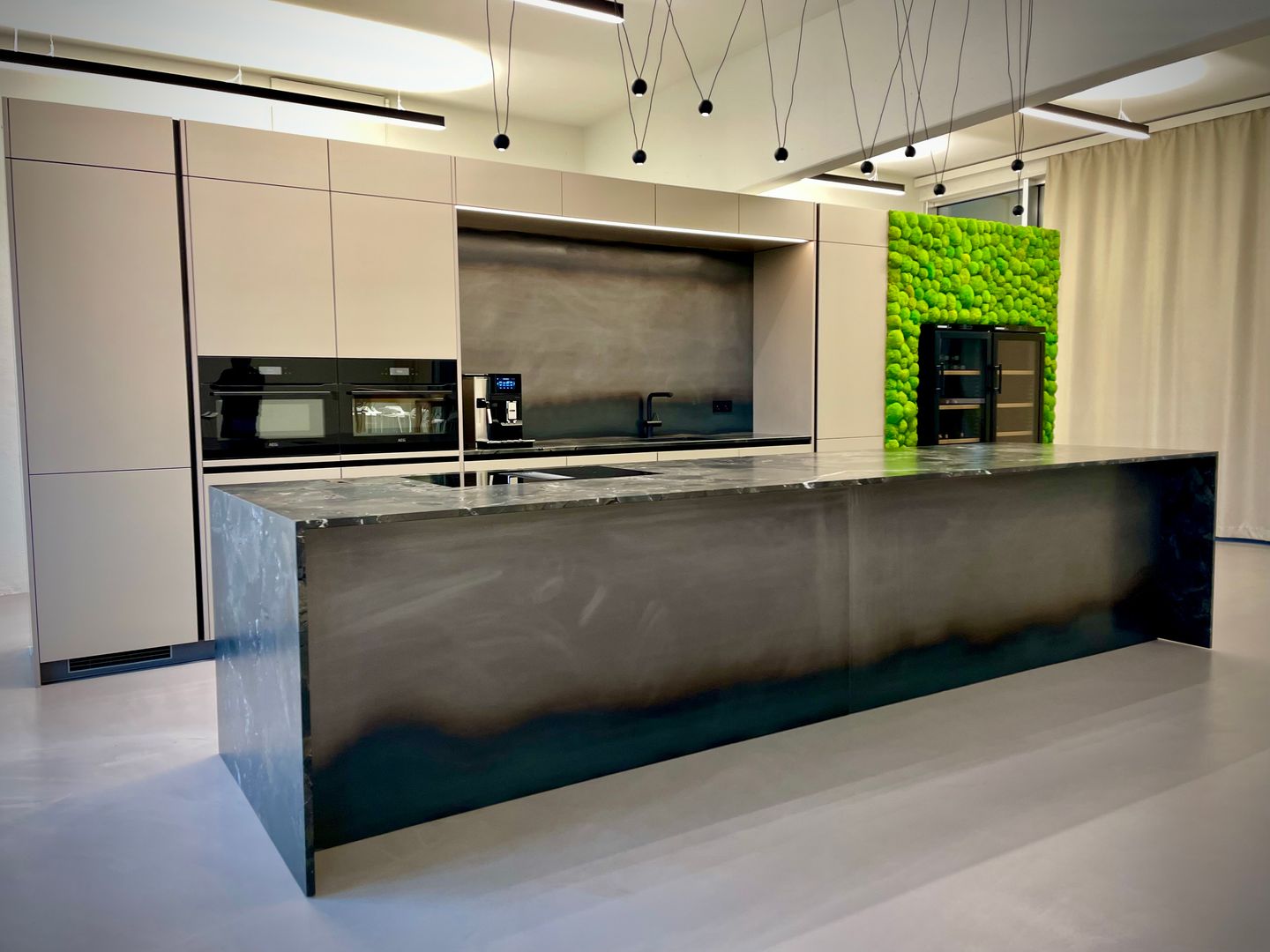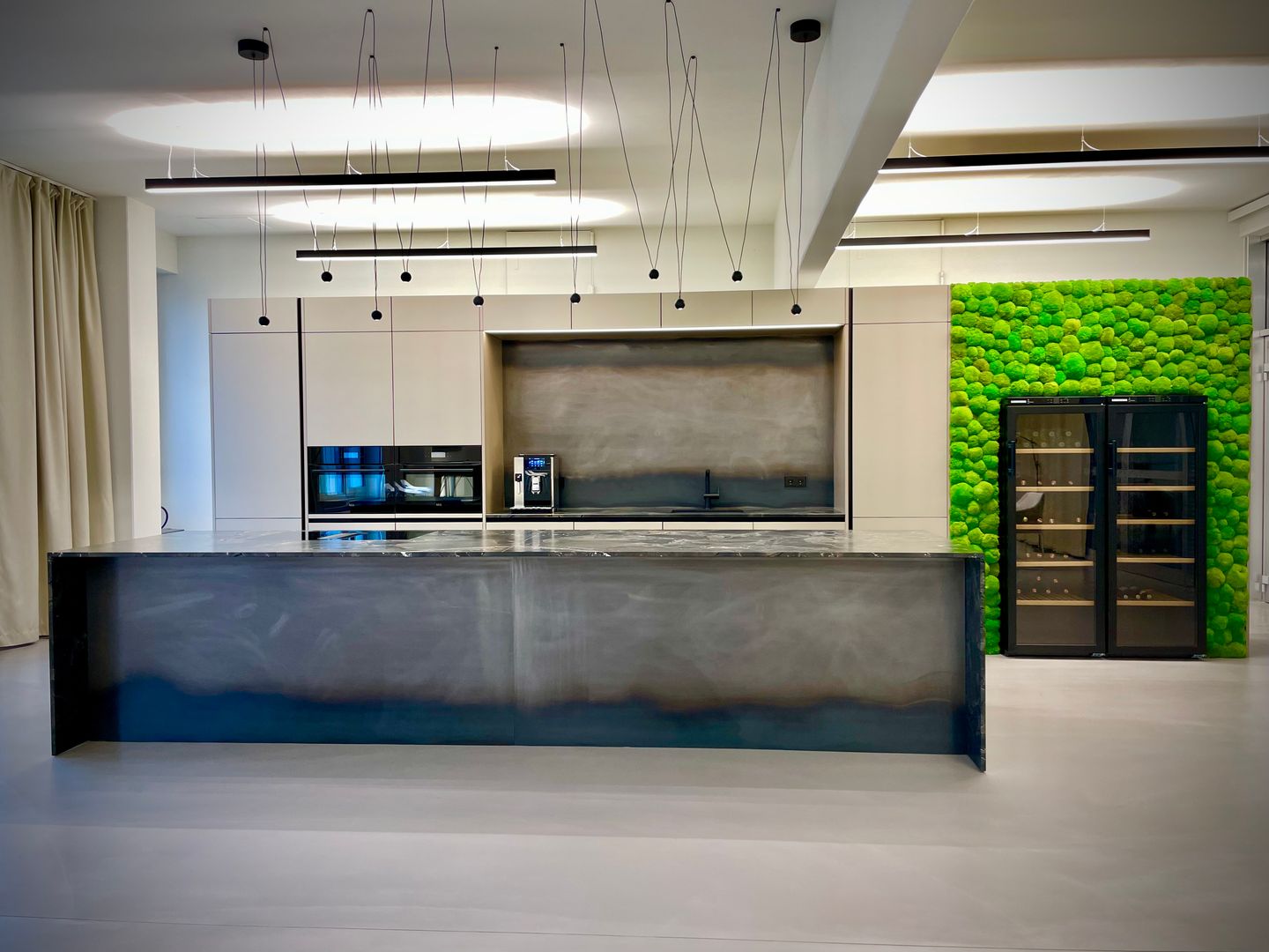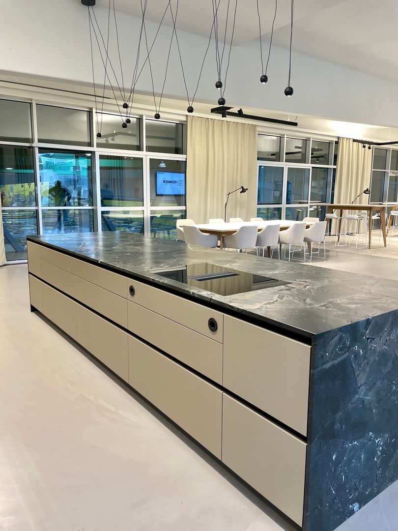Die "Mitarbeiterküche Renner" ist ein beeindruckendes Beispiel für die Kombination aus Metall- und Steinelementen und natürlichen Akzenten. Die Küche ist geprägt von dunklen, matten Oberflächen, die eine professionelle und zugleich einladende Atmosphäre schaffen. Die Steinoptik der Arbeitsflächen und die modernen, integrierten Elektrogeräte stechen heraus, was der Küche einen funktionalen und gleichzeitig stilvollen Charakter verleiht. Diese Mitarbeiterküche ist perfekt auf die Bedürfnisse eines anspruchsvollen Arbeitsumfelds abgestimmt, in welchen Effizienz und Design Hand in Hand gehen.