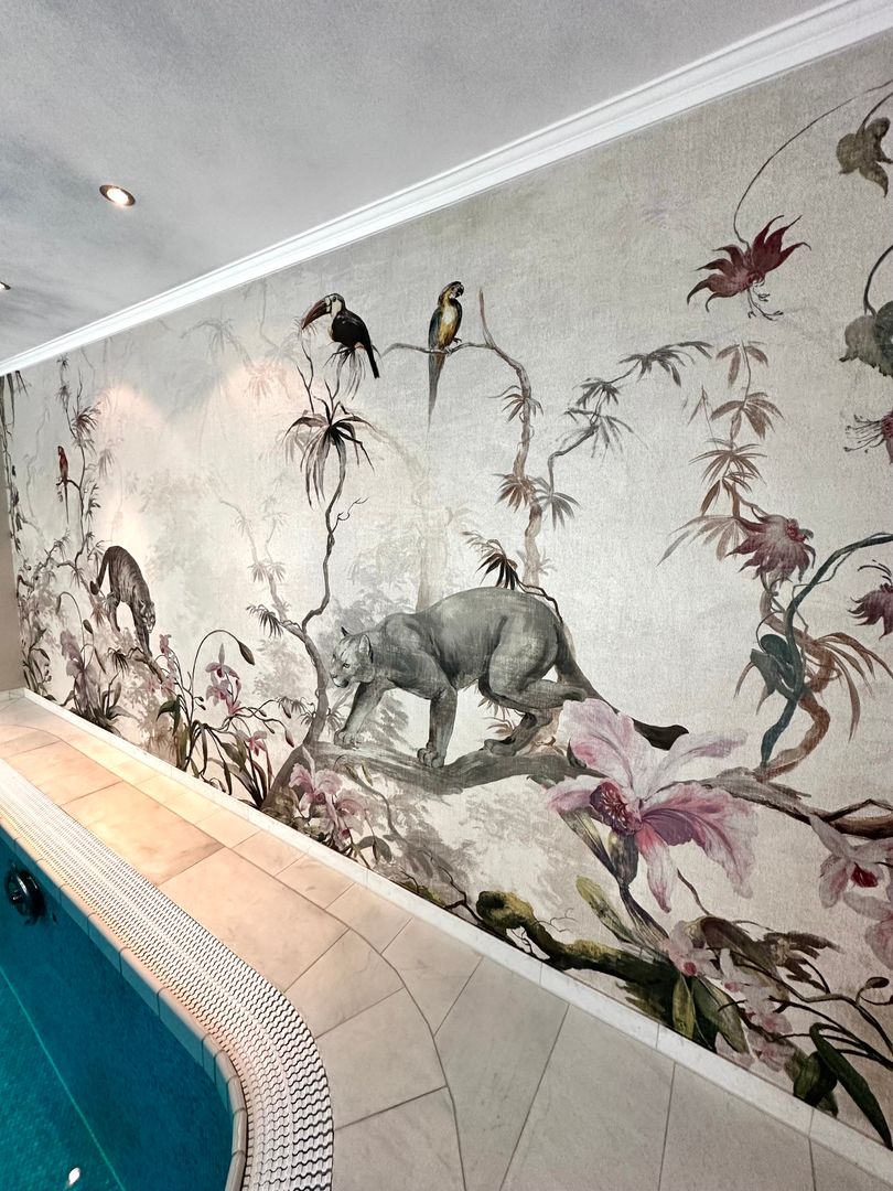 Bei uns hört Einrichten nicht beim Wohnraum auf. Diese wunderschöne Tapete, die besonderen Pflanztöpfe, die außergewöhnliche Leuchte, Teppich und Sonnenliege findet Ihr ebenfalls in unserem Programm.